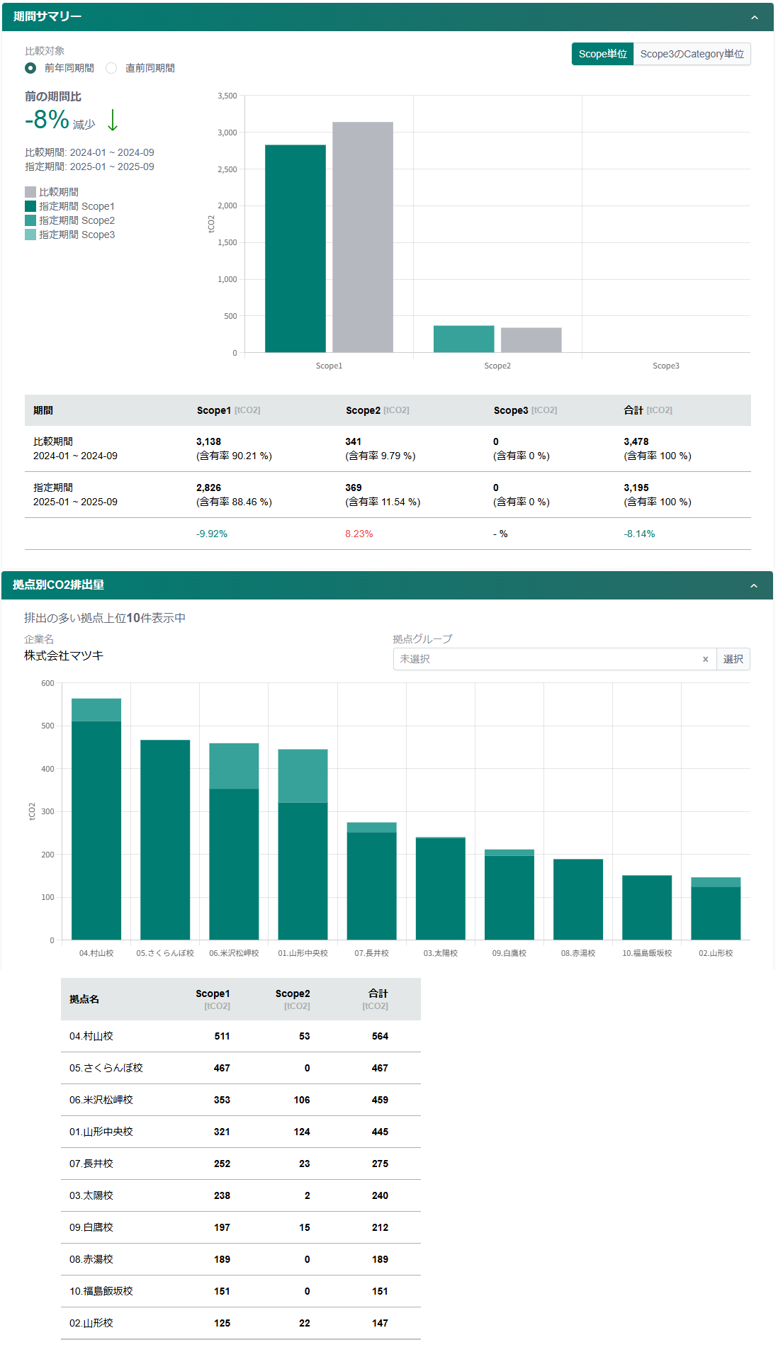 2023年より株式会社ゼロボード(Zeroboard Inc.)の協力を得て、温室効果ガス排出量をScope1(事業者自らによる直接の排出)、Scope2(他社から供給された電気や各種エネルギーの使用に伴う排出)に分け、過去3年にわたり算定し見える化を実施。可視化された温室効果ガス排出量を基にその削減の取り組みに生かしております。